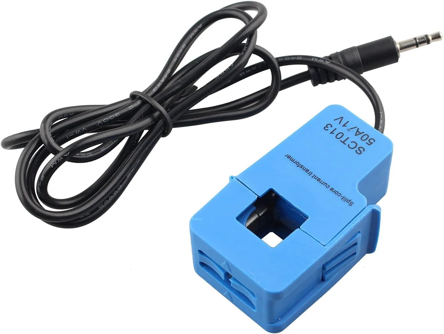 This non-invasive current sensor clamped around the supply line can measure a load up to 50 Amps, and allow you to calculate how much current pass through it. It can be useful for building your own energy monitor or for building an over-current protection device for an AC load. This current clamp can be used to detect a current of up to 50A. Simply clip it around the current source that you wish to measure and it will produce a (very) small AC voltage proportional to the current. The cable is terminated on one end with a standard 3.5mm jack (like a headphone jack).
