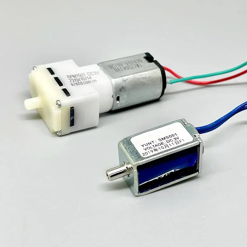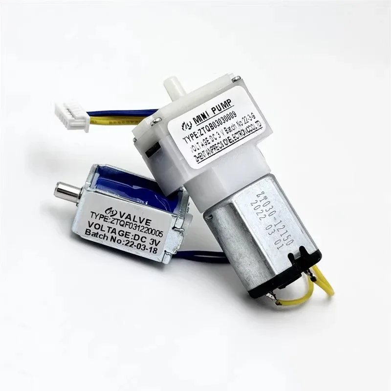 A compact DC-powered air pump paired with a miniature solenoid valve, designed as an accessory for automatic wrist blood pressure monitors. These components work together to inflate the cuff and control air release during measurement.