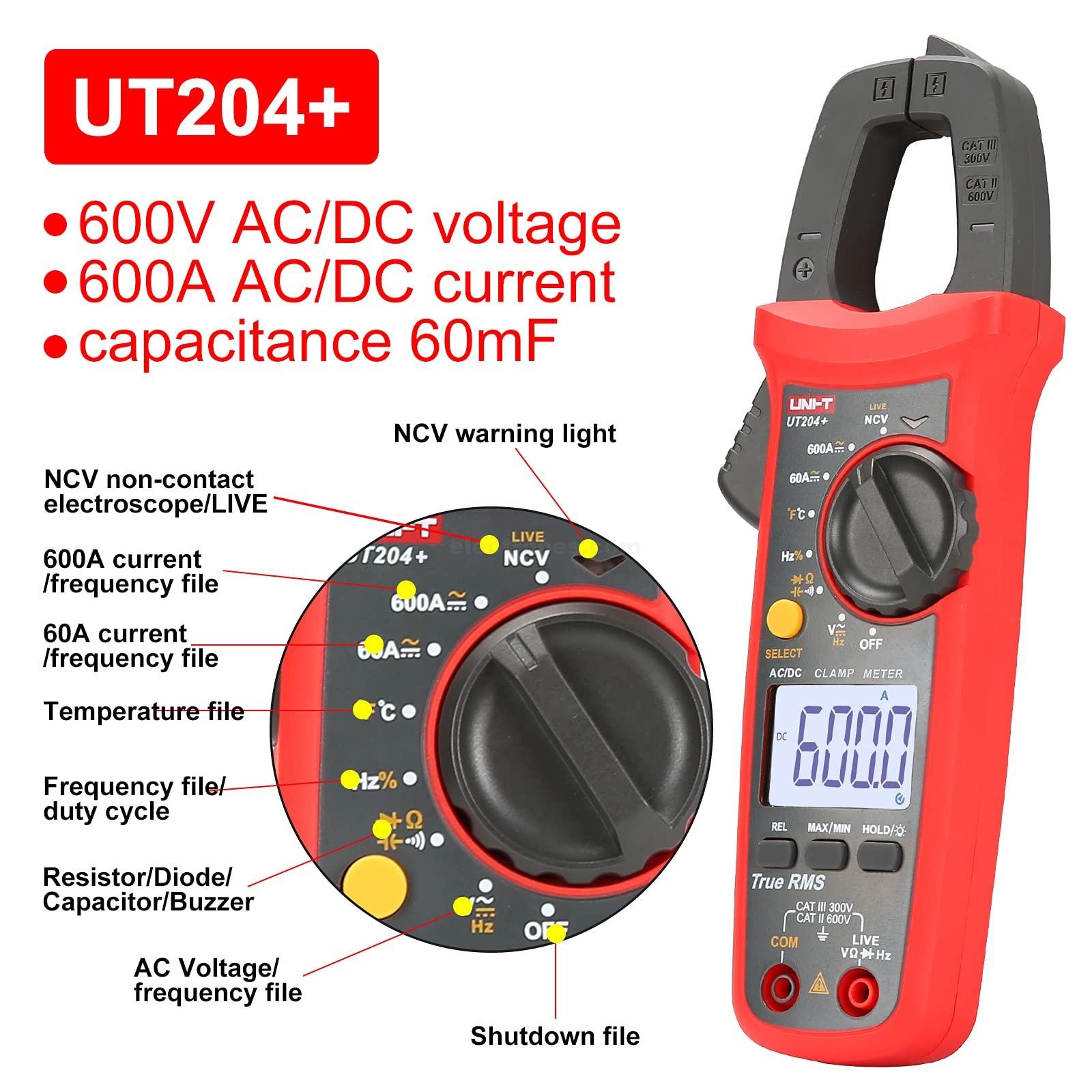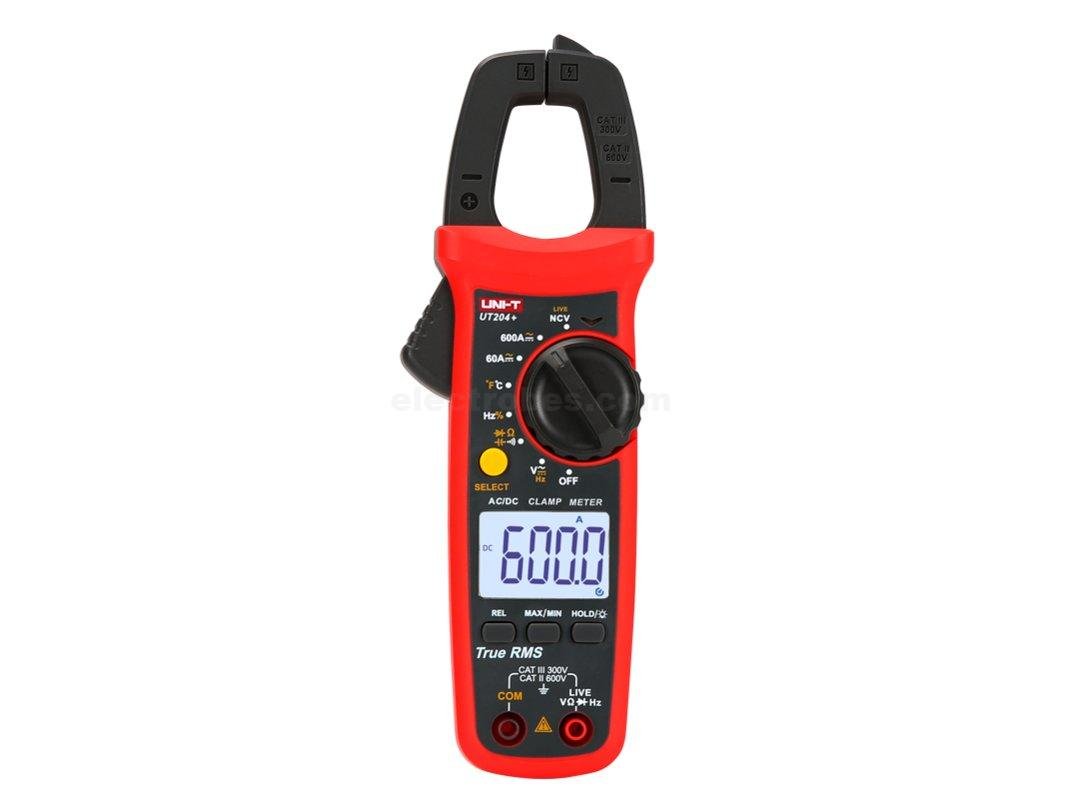 UNI-T UT204+ Digital Clamp Meter Multimeter NCV Auto Range True RMS MAX/MIN AC DC Current Voltage Capacitance Resistance Tester. AC DC Current Clamp Meter, having a hinged jaw integrated into an electrical. The jaws around a wire, cable or other conductors at any point in an electrical system, then measure current in that circuit without disconnecting/de-energizing it.